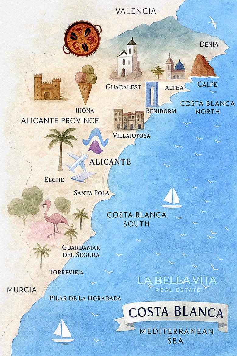 The region includes well-known locations such as Alicante city, Benidorm, Altea, Jávea, Torrevieja, Guardamar del Segura and Orihuela Costa, alongside smaller coastal towns and quieter inland areas.