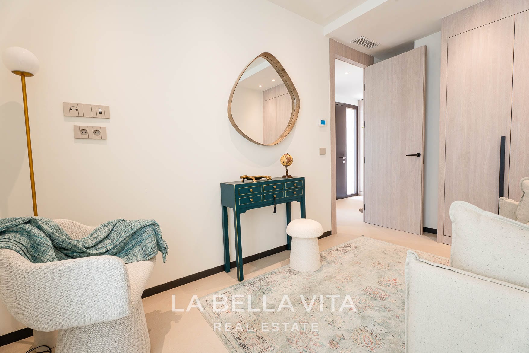 Disfrute de su propio jardín privado con zona de barbacoa, piscina infinita de diseño con banco de relajación y hermosas áreas ajardinadas para relajarse bajo el sol español. Una característica rara en las villas modernas: un garaje subterráneo privado (196,65 m²) con mucho espacio para vehículos, almacenamiento o incluso un gimnasio en casa o una sala de cine.