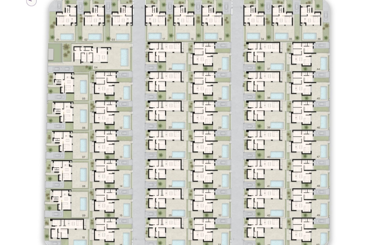 • Square-shaped single-story villas, perfect for a sleek and compact layout.