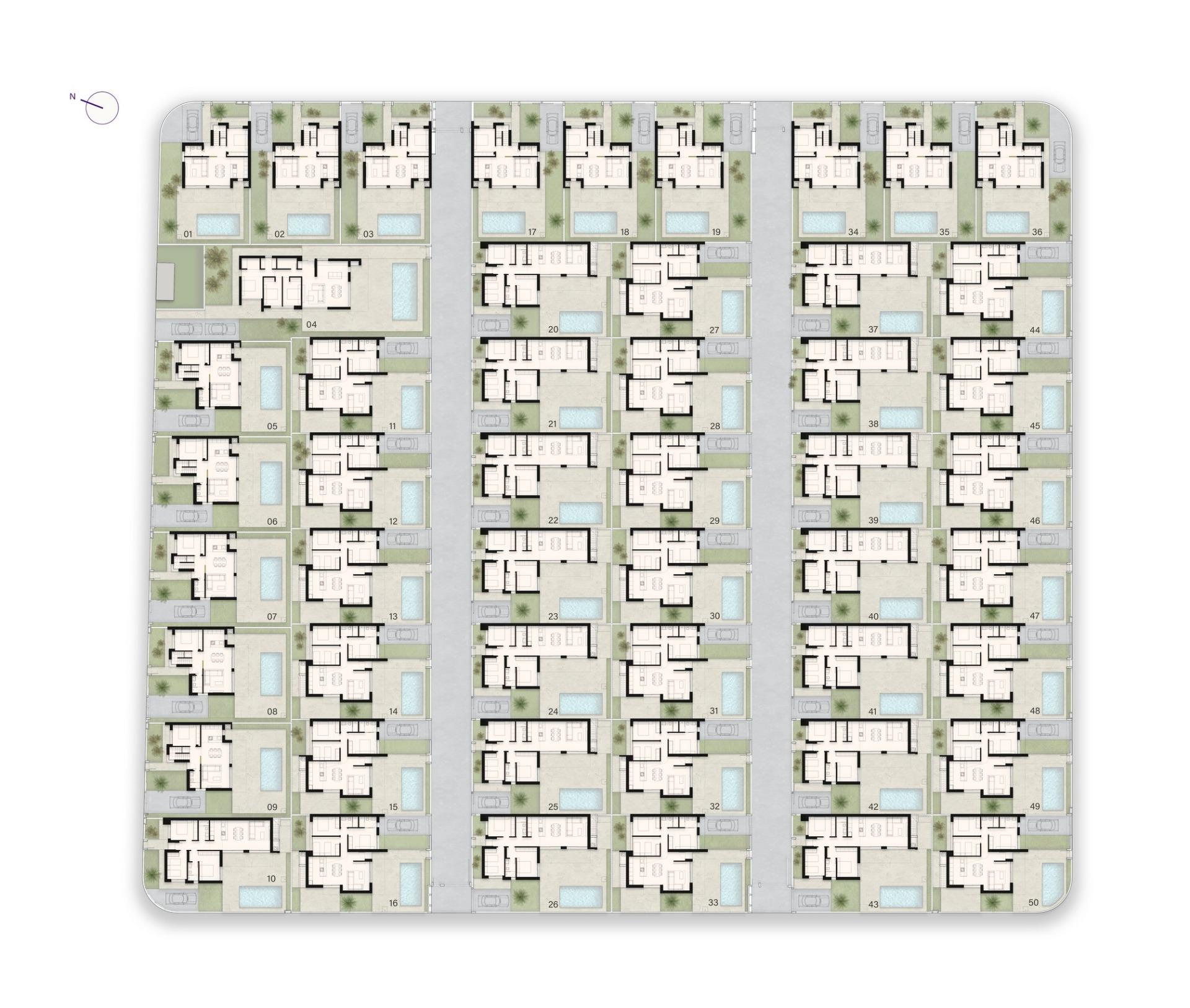 • Square-shaped single-story villas, perfect for a sleek and compact layout.