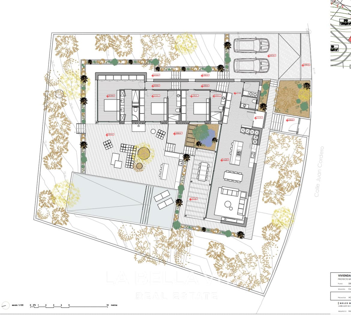 The villa sits gently on the plot, respecting its natural contours, while the L-shaped floor plan creates protected terraces, intimate corners and open perspectives towards the garden and pool.