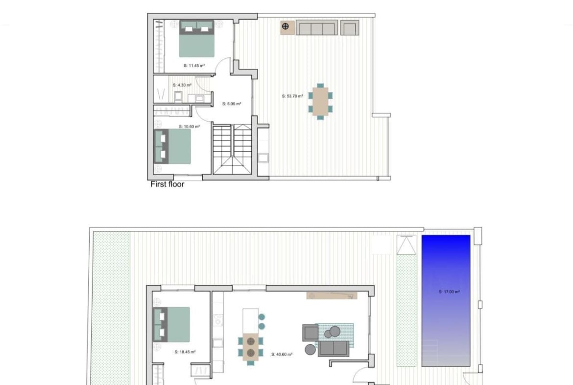 On the ground floor, the villa offers an open plan living and dining area with a modern kitchen and direct access to the terrace, swimming pool and garage. This level also includes a large bedroom with walk in wardrobe and en suite bathroom, plus an additional guest bathroom. The first floor features two bedrooms that share a bathroom and a generous uncovered terrace of 53 m2, ideal for relaxing, entertaining and enjoying the Mediterranean climate.