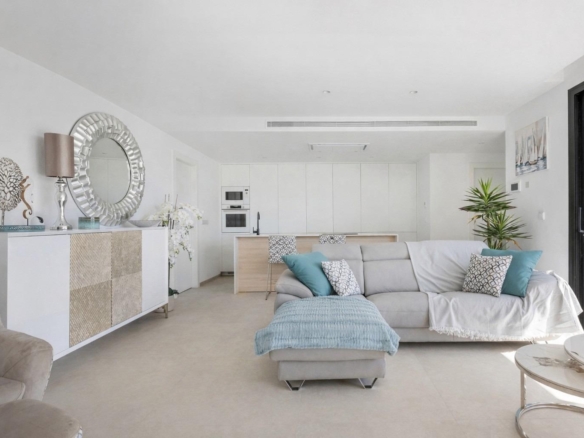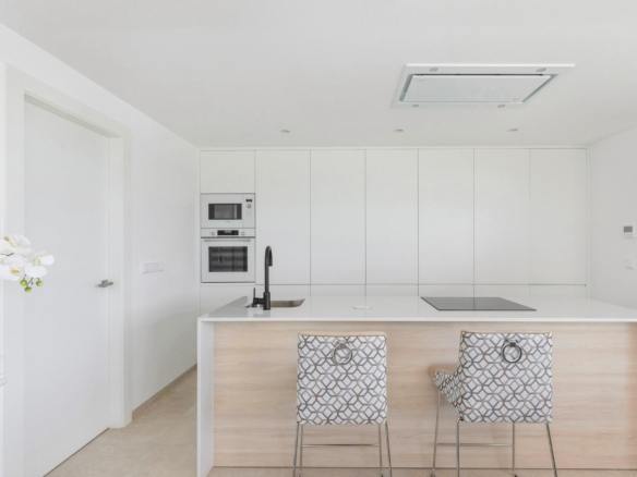 The interiors are designed around a bright and modern open-plan living concept, with the living and dining area flowing naturally into the contemporary kitchen. Large windows bring in plenty of natural light and create a direct connection with the terrace and pool area, enhancing the indoor-outdoor lifestyle that defines modern living on the Costa Cálida.