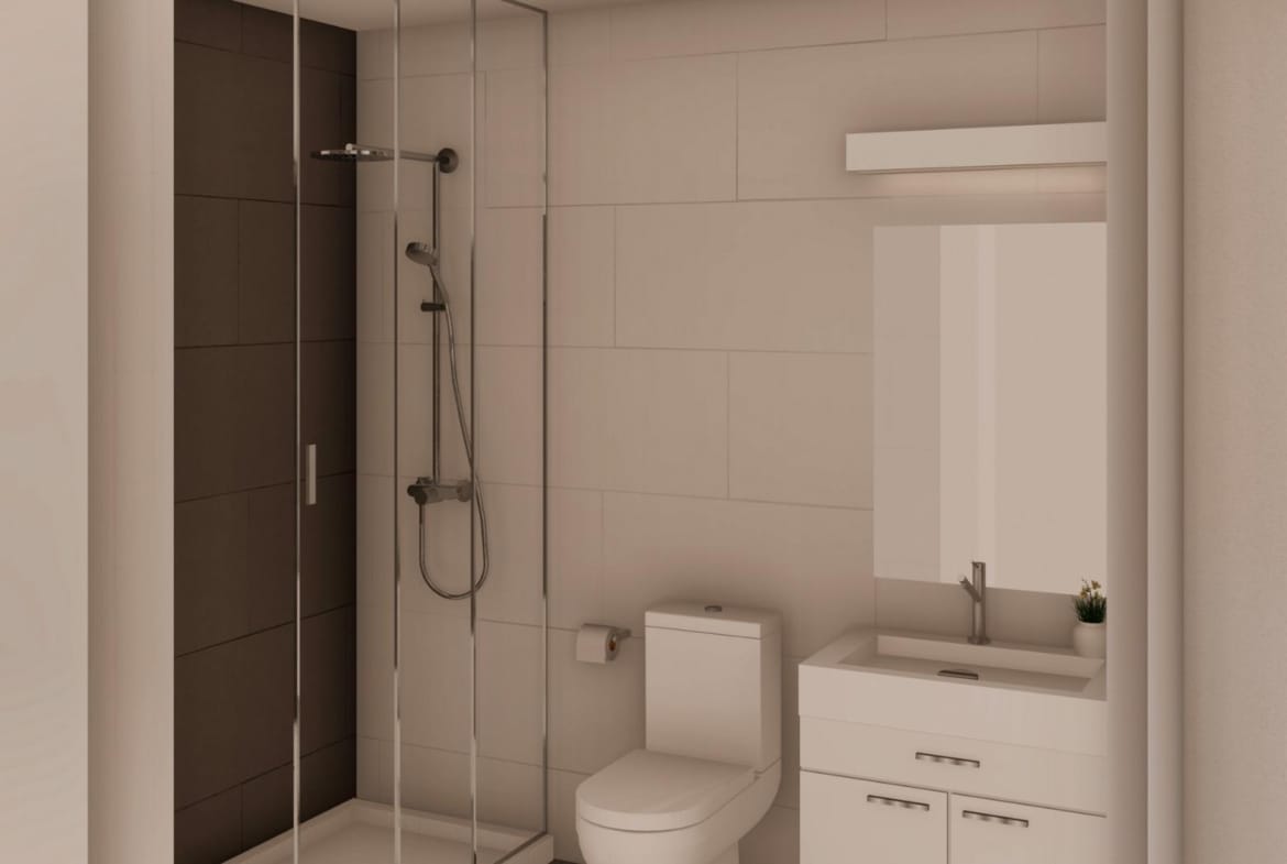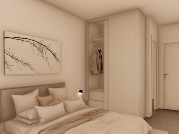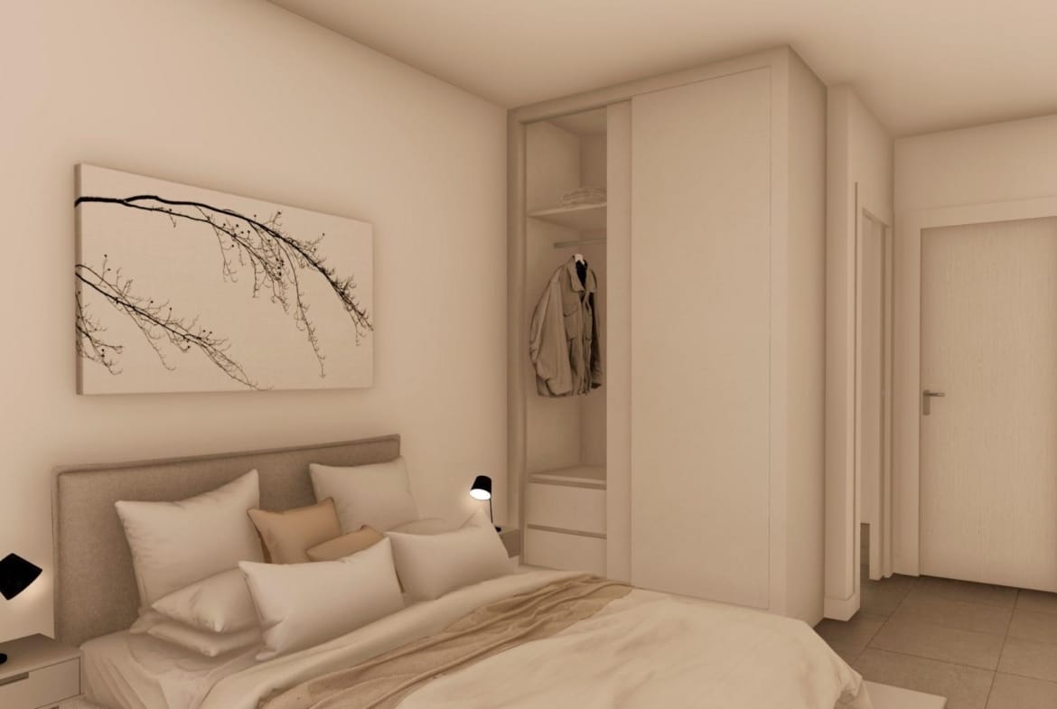 The interiors, elegant and functional, have high quality floors, fully fitted kitchens in white combined with imitation wood, including electrical appliances. The bathrooms have a vanity unit with washbasin and light. The bedrooms include lined wardrobes with drawers and sliding doors and each property has pre-installation for ducted air conditioning.