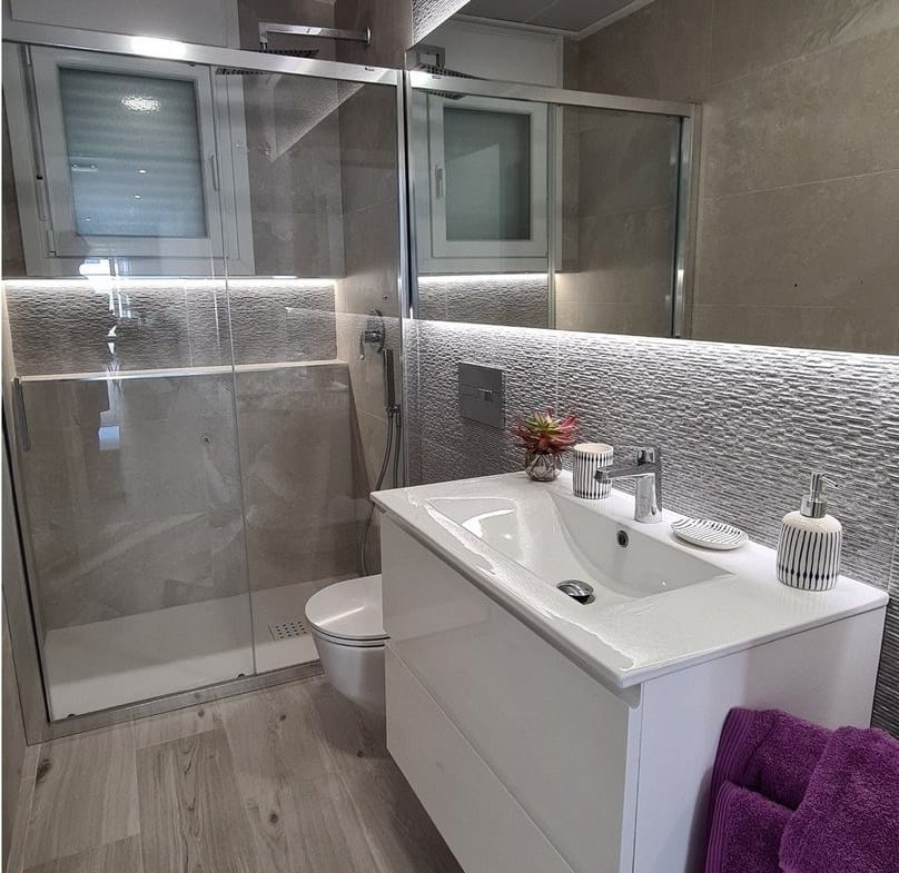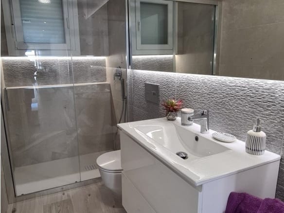 Fully fitted bathrooms with: suspended toilet, vanity unit, mirror and rainfall shower column.