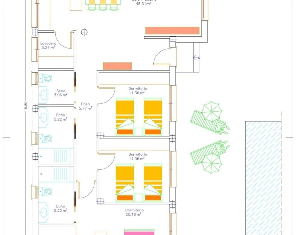 The villas are designed on one level with terraced areas around it and have 3 bedrooms, including dressing room in the master bedroom, 2 bathrooms and a toilet.