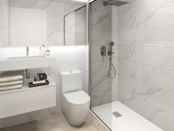 Modern bathrooms with vanity unit, lighting and glass screen