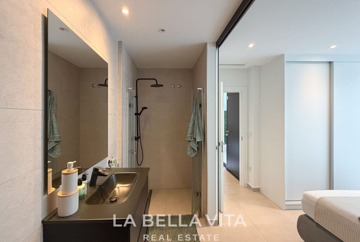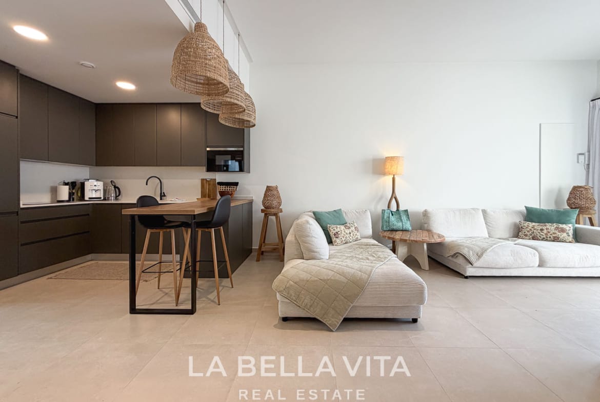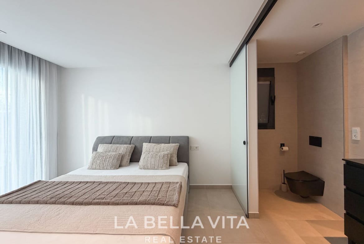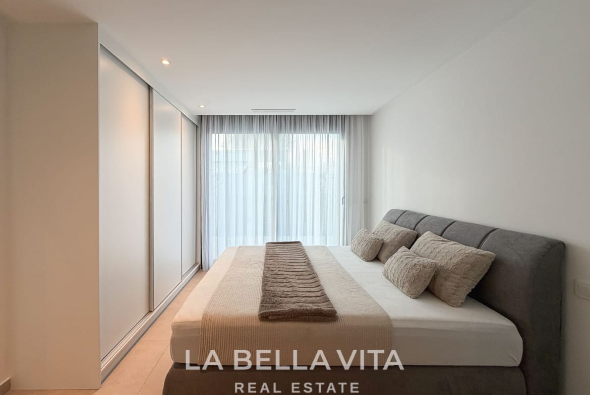 The interior stands out for its contemporary architecture, clean lines and abundant natural light. Large sliding doors connect the living space directly to the terrace and pool area, creating a seamless indoor-outdoor flow.