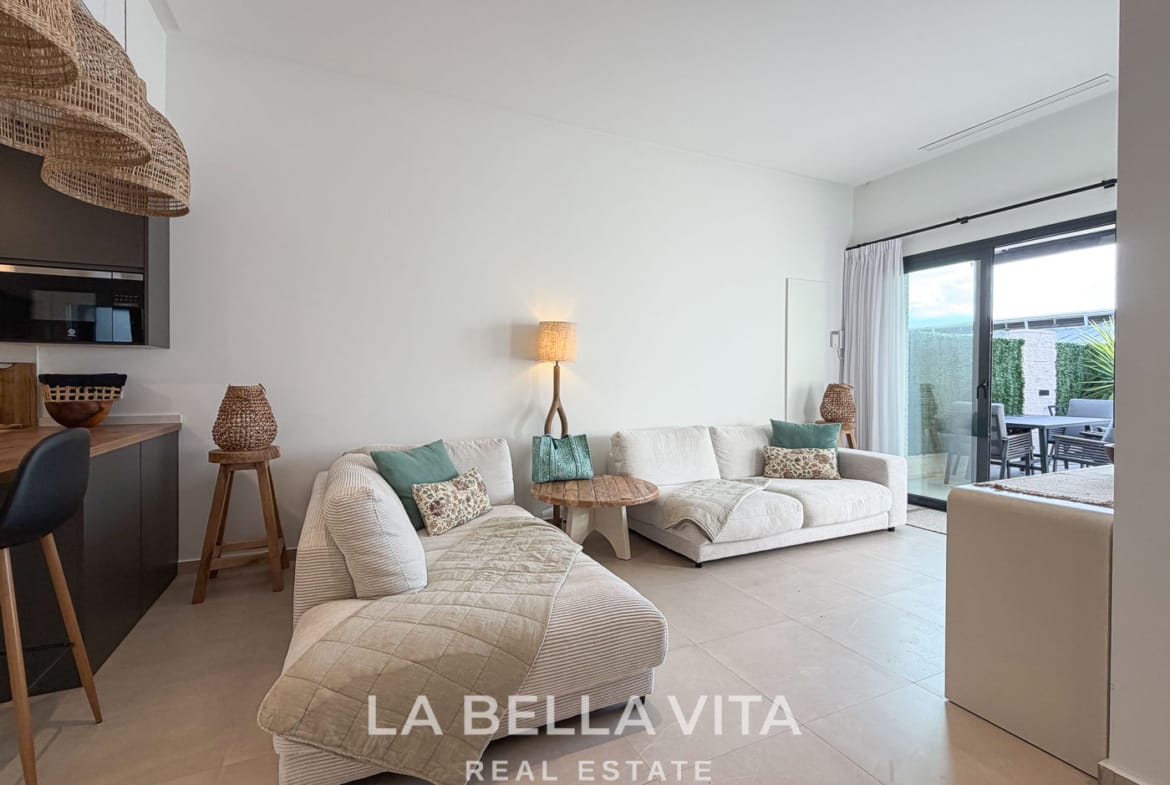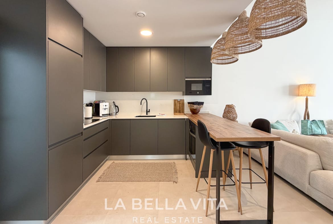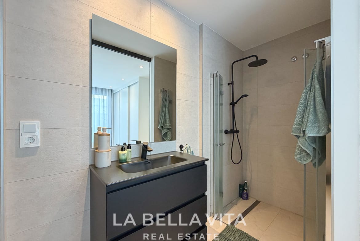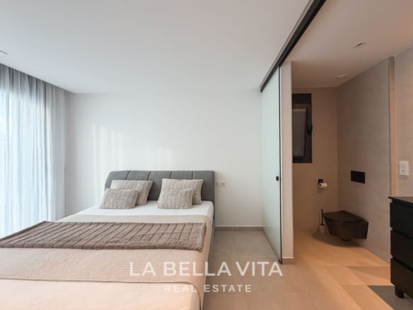 The interior stands out for its contemporary architecture, clean lines and abundant natural light. Large sliding doors connect the living space directly to the terrace and pool area, creating a seamless indoor-outdoor flow.