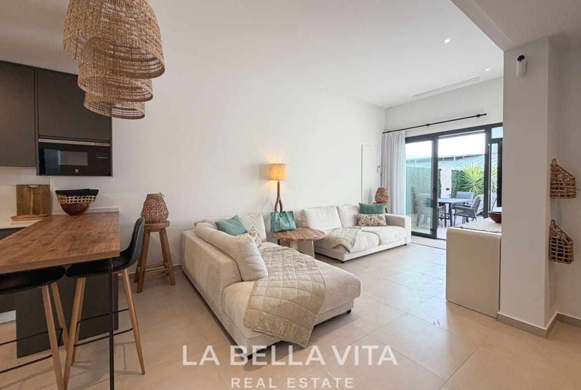 Originally designed as a 3-bedroom villa, the property has been intelligently reconfigured to create an exceptionally spacious open-plan living area, now offering 2 generous bedrooms and 2 modern bathrooms. If desired, the third bedroom can easily be reinstated, making this home flexible for different lifestyle needs.