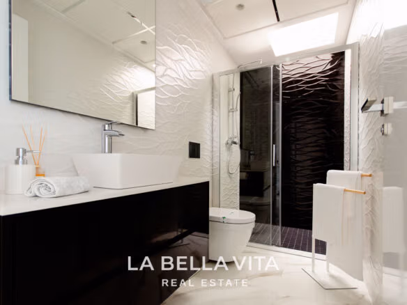 Inside, the villa offers a spacious open-plan living area, ideal for entertaining and family life, along with two elegant bedrooms and two full bathrooms on the ground floor, including an en-suite in the master bedroom. The upper level hosts a large bedroom, complete with a bathroom and an extensive wardrobe, and opens onto a 50 m2 terrace-solarium. This terrace is a perfect private retreat for enjoying the breathtaking views of Costa Blanca and soaking in the sun.